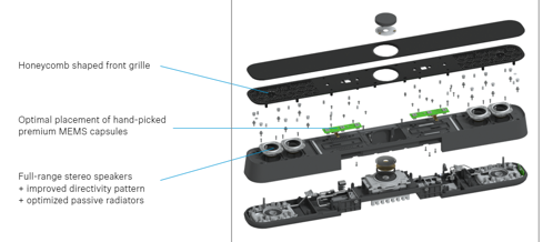 several days, the submissions were thoroughly reviewed and assessed according to their design quality and degree of innovation. Following the assessment, the jury unanimously said: “The high-quality fabric covering elegantly conceals the powerful speakers and microphone array. The central camera module with surrounding LED ring serves as a user interface and is the striking design element of the otherwise unobtrusive device that integrates well into any environment.”